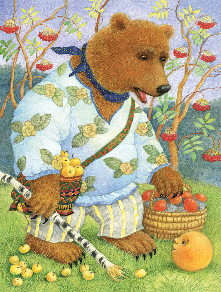 Катится колобок по лесу, а навстречу ему медведь идёт, хворост ломает, кусты к земле гнёт.