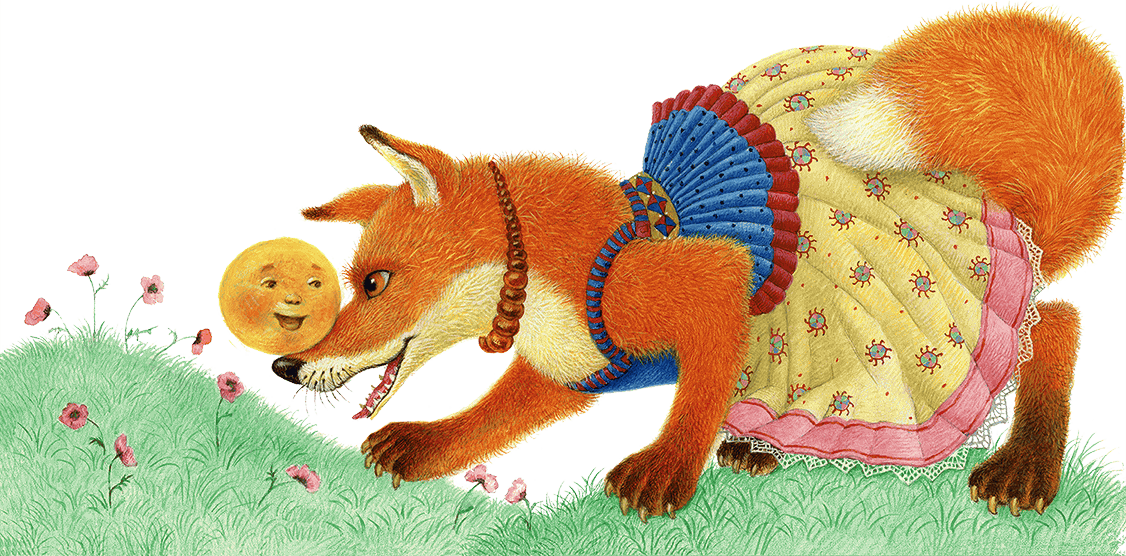 Колобок обрадовался, что его песенку похвалили, прыгнул лисе на морду да и запел: