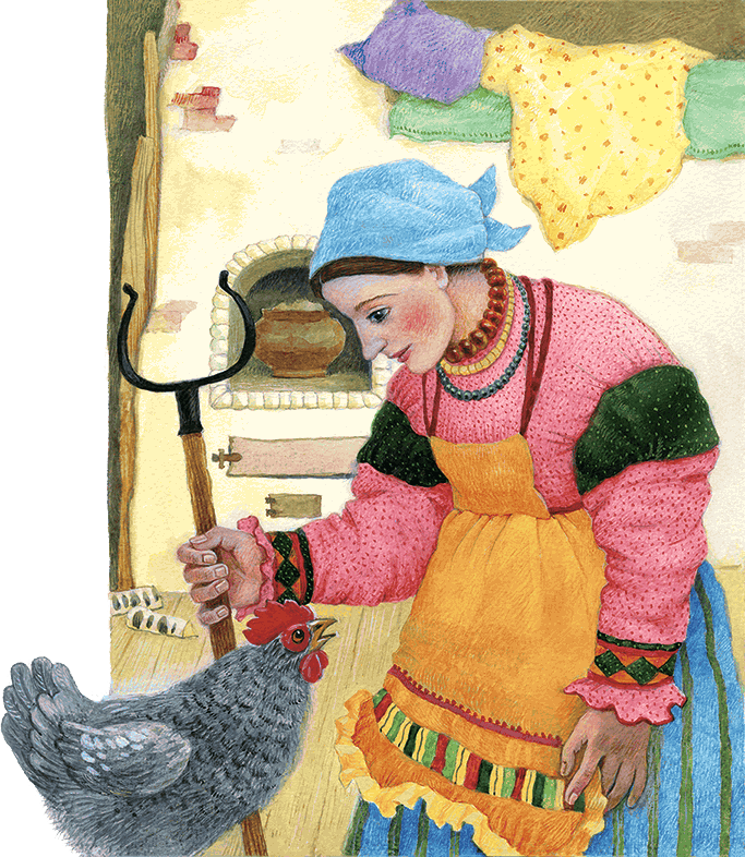 Перепугалась курочка, бросилась к хозяйке, кричит:
