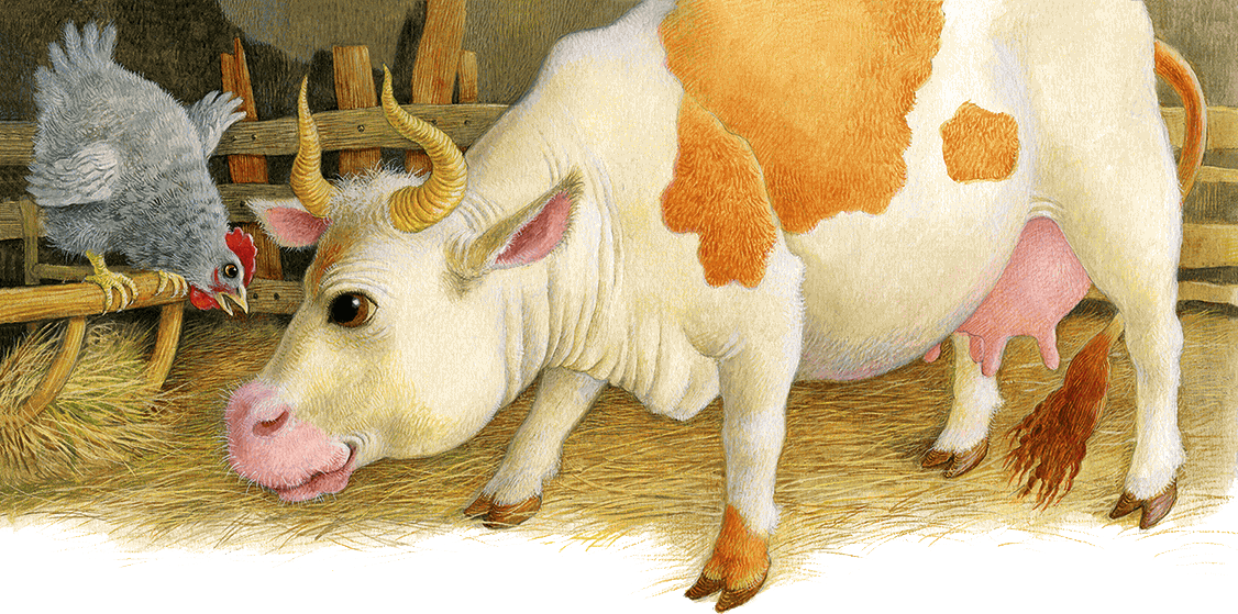 – Коровушка, голубушка, дай скорее молока, из молока хозяюшка собьёт маслица, маслицем смажу петушку горлышко: подавился петушок бобовым зёрнышком.