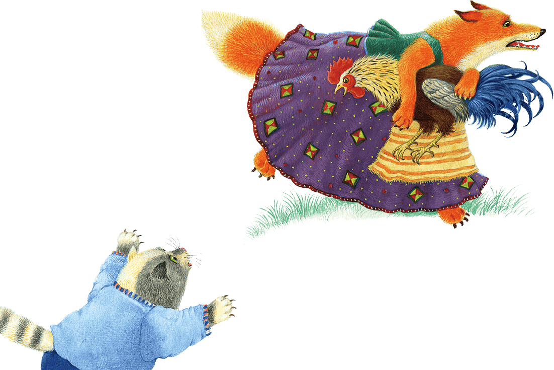 – Понесла меня лиса, понесла петуха за тёмные леса, за дремучие боры, по крутым бережкам, по высоким горам; хочет лиса меня съесть и косточек не оставит!