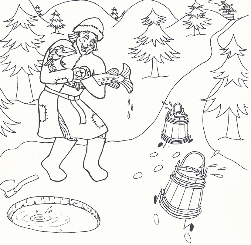 Прорубил лед, зачерпнул ведра и поставил их, а сам глядит в прорубь. И увидел Емеля в проруби щуку. Изловчился и ухватил щуку в руку: