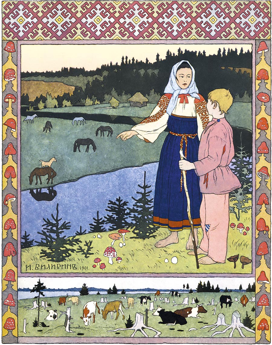 И тотчас приказал нянюшкам, и мамушкам, и всем придворным боярыням с прекрасной королевной идти в чистое поле гулять.