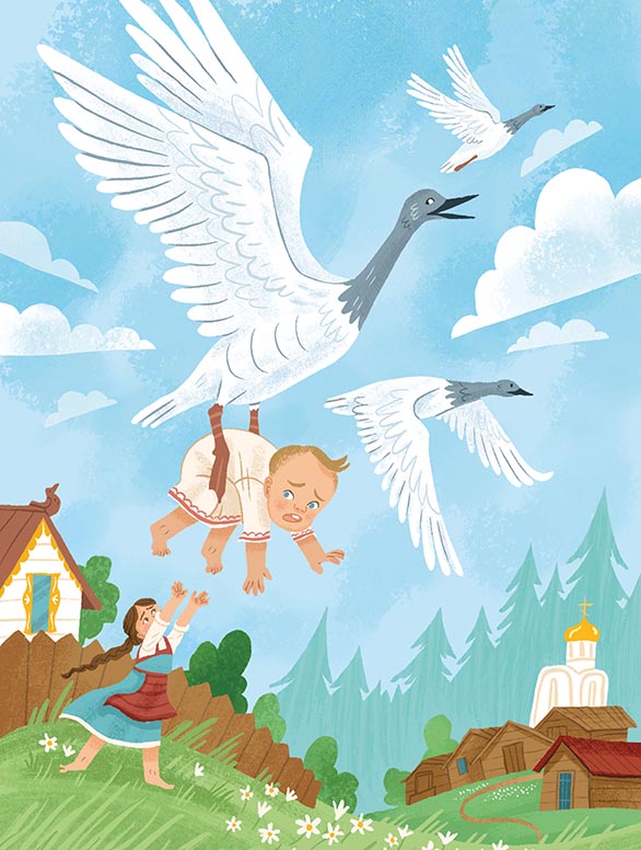 Старшие ушли, а дочка забыла, что ей приказывали; посадила братца на травке под окошком, а сама побежала на улицу, заигралась, загулялась. Налетели гуси-лебеди, подхватили мальчика, унесли на крылышках. Пришла девочка, глядь – братца нету! Ахнула, кинулась туда-сюда – нету. Кликала, заливалась слезами, причитывала, что худо будет от отца и матери, – братец не откликнулся! Выбежала она в чистое поле; метнулись вдалеке гуси-лебеди и пропали за тёмным лесом. Гуси-лебеди давно себе дурную славу нажили, много шкодили и малых детей крадывали; девочка угадала, что они унесли её братца, бросилась их догонять. Бежала-бежала, стоит печка.