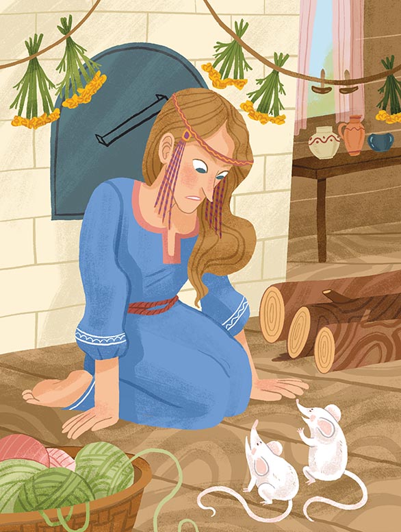 Отец простился и поехал домой. А Баба-яга задала девушке пряжи с короб, печку истопить, всего припасти, а сама ушла. Вот девушка хлопочет у печи, а сама горько плачет. Выбежали мышки и говорят ей: «Девица, девица, что ты плачешь? Дай кашки; мы тебе добренько скажем». Она дала им кашки. «А вот, – говорят, – ты на всякое веретёнце по ниточке напряди». Пришла Баба-яга: «Ну что, – говорит, – всё ли ты припасла?» А у девушки всё готово. «Ну, теперь поди – вымой меня в бане». Похвалила яга девушку и надавала ей разной сряды[2]. Опять яга ушла и ещё труднее задала задачу. Девушка опять плачет. Выбегают мышки: «Что ты, – говорят, – девица красная, плачешь? Дай кашки; мы тебе добренько скажем». Она дала им кашки, а они опять научили её, что и как сделать. Баба-яга опять, пришедши, её похвалила и ещё больше дала сряды… А мачеха посылает мужа проведать, жива ли его дочь?