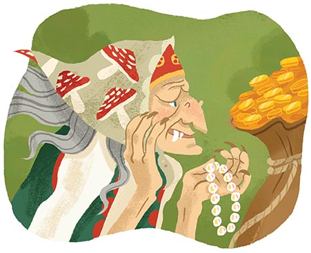 Идёт мужик в избушку, а в ней Баба-яга: впереди голова, в одном углу нога, в другом – другая. «Русским духом пахнет!» – говорит яга. Мужик кланяется: «Баба-яга костяная нога! Я тебе дочку привёз в услуженье». – «Ну хорошо! Служи, служи мне, – говорит яга девушке, – я тебя за это награжу».