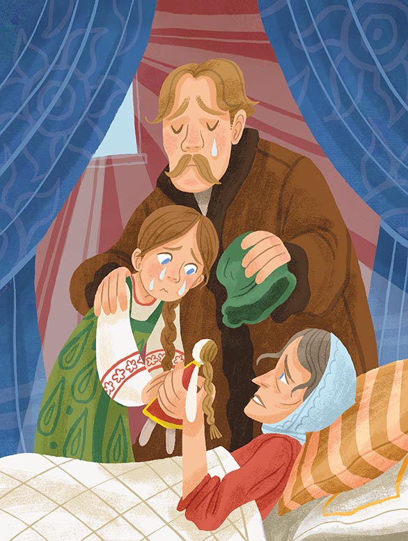В некотором царстве жил-был купец. Двенадцать лет жил он в супружестве, и была у него одна только дочь, Василиса Прекрасная. Когда мать скончалась, девочке было восемь лет. Умирая, купчиха призвала к себе дочку, вынула из-под одеяла куклу, отдала ей и сказала: «Слушай, Василисушка! Помни и исполни последние мои слова. Я умираю и вместе с родительским благословением оставляю тебе вот эту куклу; береги её всегда при себе и никому не показывай; а когда приключится тебе какое горе, дай ей поесть и спроси у неё совета. Покушает она и скажет тебе, чем помочь несчастью». Затем мать поцеловала дочку и померла.