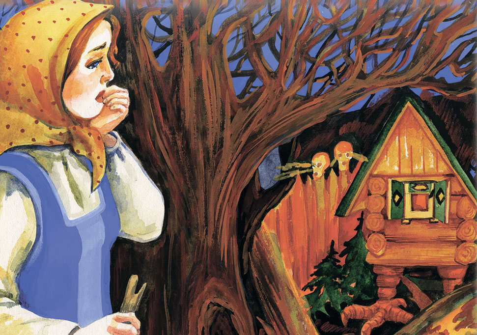 Долго ли, коротко ли шла – башмаки железные износила, посох железный поломала, колпак железный порвала. Вышла на полянку, а на полянке избушка на курьих ножках, вокруг тын, а на кольях лошадиные черепа; каждый череп огнём горит…