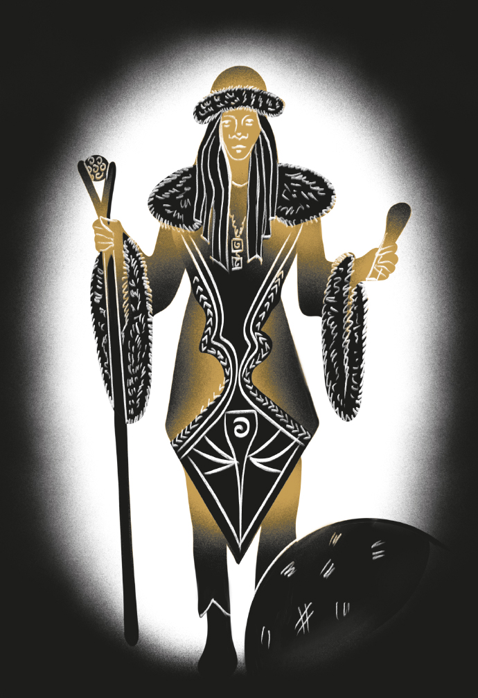 Старичок надевает тонкую шубку, сшитую из гладкого, как стрела, меха олененка. Надевает кисы, пестрые, как шкурка со спины бурундука. Надевает на ноги лыжи-подволоки, подбитые шкуркой взрослой выдры. Берет один куженек с костями вороны, один куженек с костями сороки. Вешает на спину крепкий лук с железной спинкой, берет в руки добрый посох, сделанный умельцем.