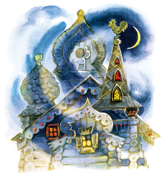 К вечеру прилетел он в неведомое царство, опустился на край города. Видит – стоит избушка маленькая.