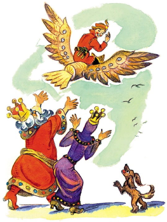 – Вернись скорей! Куда ты? Убьёшься! – кричат ему царь с царицей.
