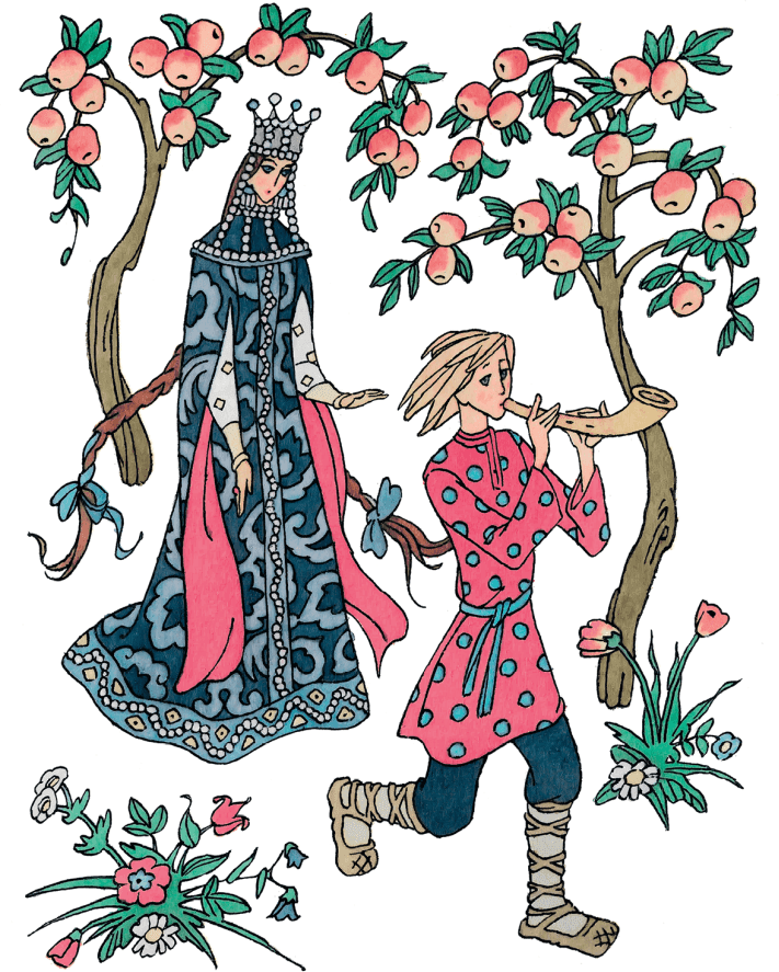 – Хорошо у вас на море-океане, на острове Буяне, а на Руси-матушке во сто крат лучше! У нас луга зелёные, реки синие! У нас поля бескрайние, у заводей берёзки белые, в лугах цветы лазоревые. У нас заря с зарёй сходится, месяц на небе звёзды пасёт. У нас росы медвяные, ручьи серебряные. Выйдет утром пастух на зелёный луг, заиграет в берестяной рожок – и не хочешь, а за ним пойдёшь…