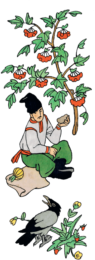 И решил передохнуть. Уселся под деревце, достал лепёшку, лук… Вдруг из леса старая ворона хромает. Подошла и просит: