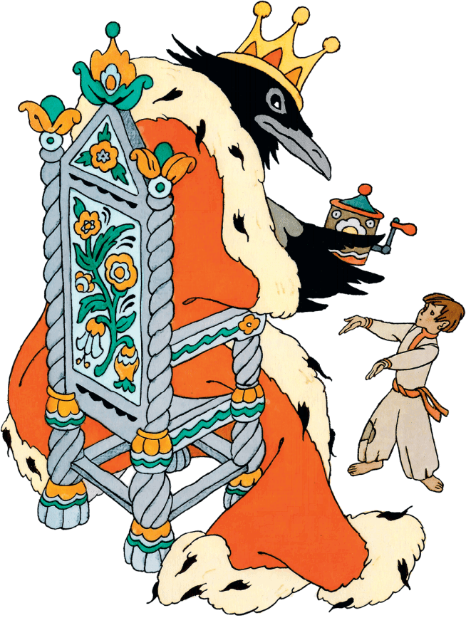 Поднялся наш путешественник на холм, вошёл во дворец. А там стража из одних ворон. Проводили его к Вороньему царю. Сидит царь на серебряном троне и на гостя зорко поглядывает.