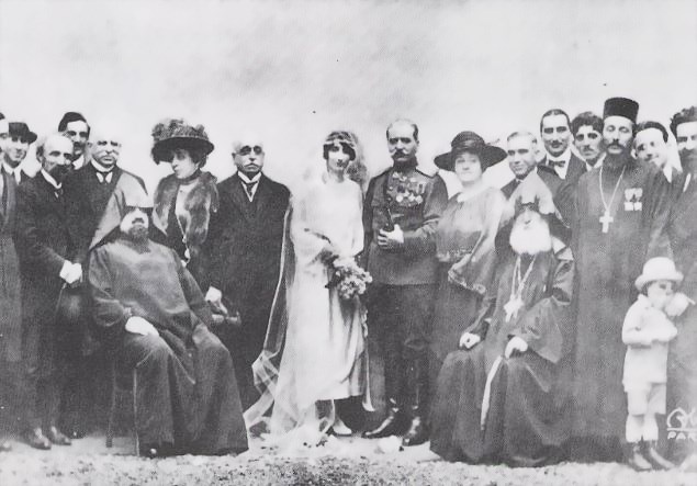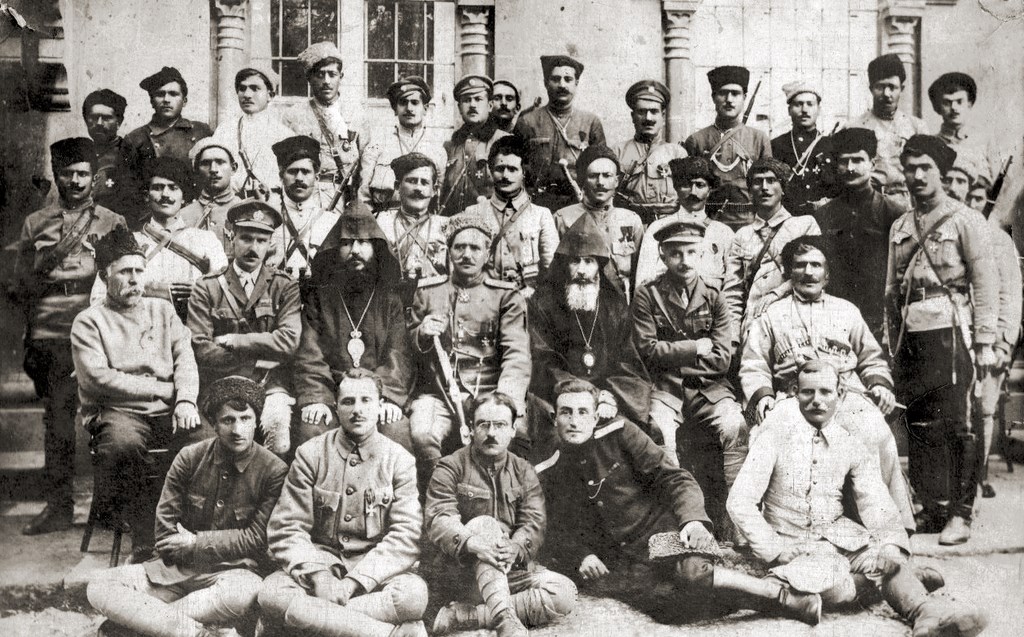Andranik with his men and two archbishops in Etchmiadzin just before leaving Armenia, April 1919