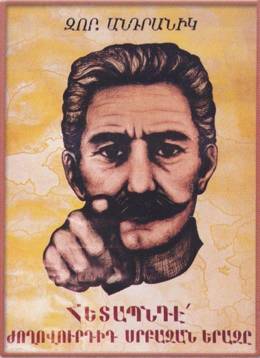 Lord Kitchener Wants You-influenced poster depicting Andranik. The caption reads "Chase the holy dream of your people".