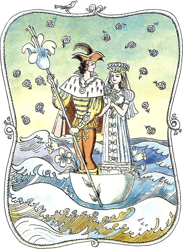 А тем временем озеро наново водой налилось. Велел король схватить колдунью и в озеро бросить. А Церцерушку во дворец повел, тотчас позвал священника, и священник в тот же день обвенчал их. Сели молодые в скорлупу яичную и поплыли вниз по речке.