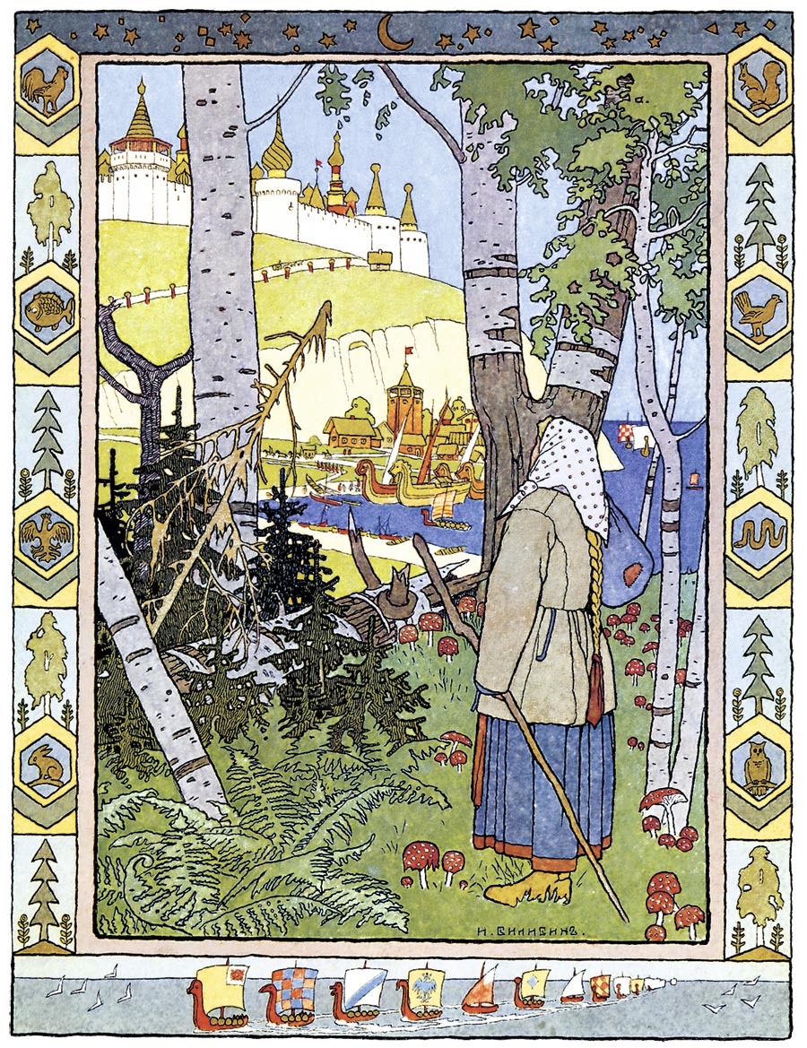 Поблагодарила девица старуху и пошла за своим клубочком. Шла-шла, вышла на берег синего моря – широкого и раздольного, – а вдали как жар горят золотые маковки на высоких теремах белокаменных.
