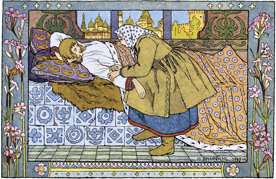 – Ну, теперь ступай, девица; а вот тебе мой подарок – золотое пялечко да иголочка. Ты только пялечко держи, а иголочка сама вышивать будет. Придёшь ты в тридевятое царство, в тридесятое государство, сядешь у синего моря; выйдет к тебе царевна, на которой Финист – Ясен сокол женился, станет покупать у тебя пялечко с иголочкой, так ты ничего не бери, только проси посмотреть на Финиста – Ясна сокола.