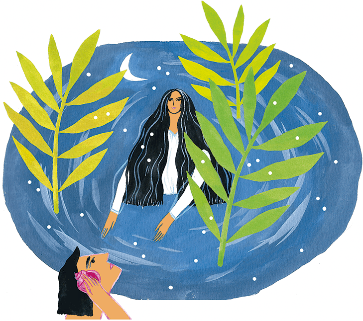 Спустился юноша к озеру, сбросил с себя одежду и только собрался нырнуть, как показалась из-за тучи луна и озарила ярким светом заросли папоротника. Увидел Алонзо женщину неописуемой красоты: чёрные волосы ниспадали с её головы, словно волны.