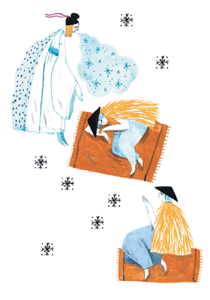 Через несколько часов Минокичи проснулся. Померещилось ему, что снег летит прямо в лицо. Оказалось, что дверь лачуги открыта нараспашку, а над его учителем склонилась женщина в ослепительно-белом одеянии. Белее снега было её лицо, волосы покрыты инеем, а пальцы – точно льдинки. Женщина выдохнула студёное облачко в лицо старого Мосаки и посмотрела на Минокичи.