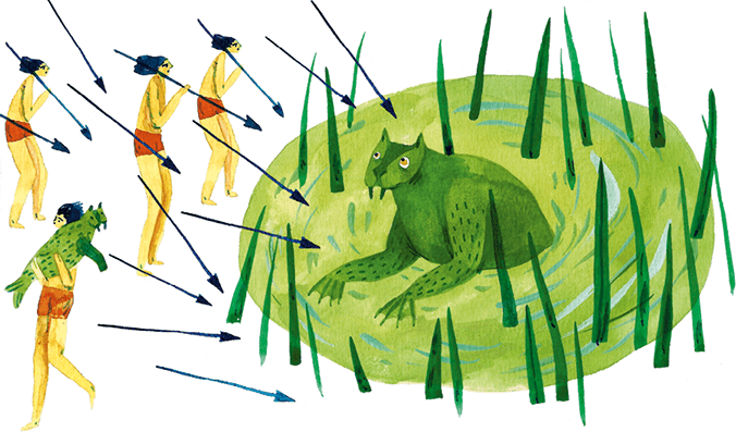 Долго ли, коротко ли, пришли они в долину. Посреди неё раскинулось широкое озеро, заросшее камышом. Корни растения вкусны и питательны, но молодые охотники не желали плескаться в воде, а потому принялись рыбачить.