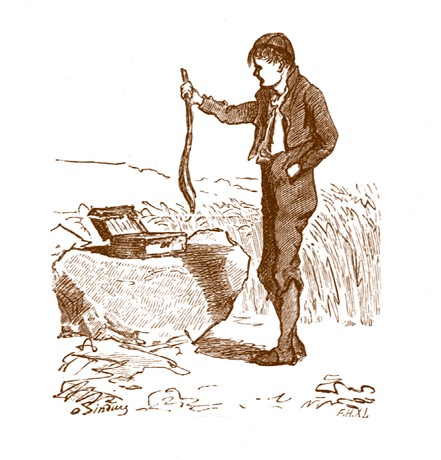 Пошёл дальше, шёл-шёл и ключик нашёл. А уж притомился, на землю опустился. И подумал: вот бы ключик по ларчику был. Достал он из кармана ларчик, дунул на ключик, потом в щёлочку для ключика на ларчике дунул, потом ключик в щёлочку вставил и повернул. Щёлк! Взялся за крышку мальчик – открылся ларчик.