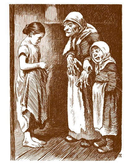 Пошла дальше. Долго шла, к большому двору вышла. А там троллиха с дочкой своей жила. Падчерица и спросила у троллихи, не найдётся ль работы.