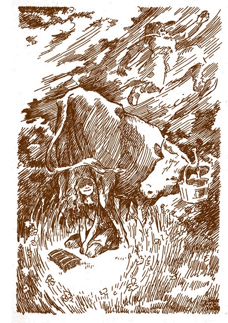 Брызнула она молока пташкам, коровы и присмирели. Выдоила падчерица коров. В дом с молоком – а троллиха бурчит:
