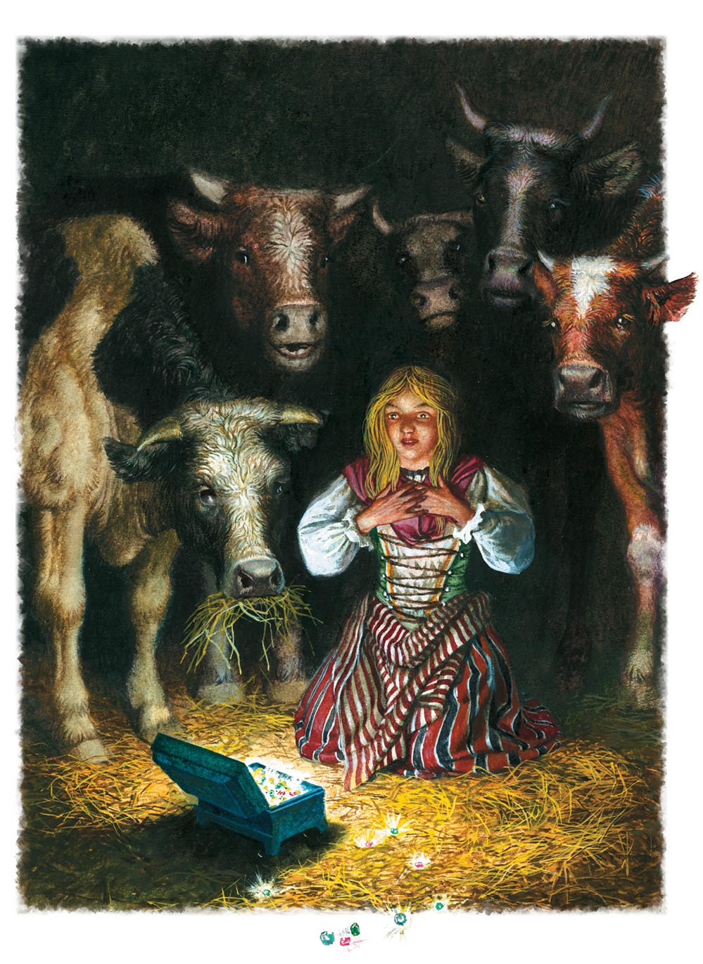 А падчерица домой воротилась. Мачеха с дочкой увидали, какой она раскрасавицей сделалась, – пуще прежнего ей позавидовали, в хлев прогнали, нет, мол, в доме ей места. Она ж вымыла там, прибрала и ларчик открыла. Чем за службу троллиха-то наградила? Тут золото, серебро, каменья всякие из ларца посыпались, засверкал хлев богаче королевского зáмка. Мачеха с дочкой от зависти чуть не лопнули. Ну допытываться, докапываться, где ларчик взяла!