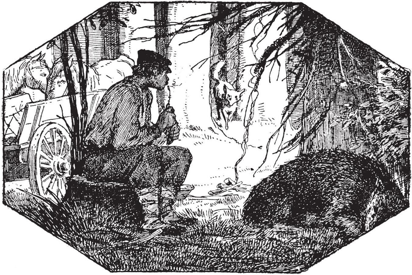 Stāv un stāv, un jūt, ka jau uznākusi nakts. Kurpniekam tīri bail sametas palikt vienam mežā pa nakti. Redzēt arī nekā nevar.