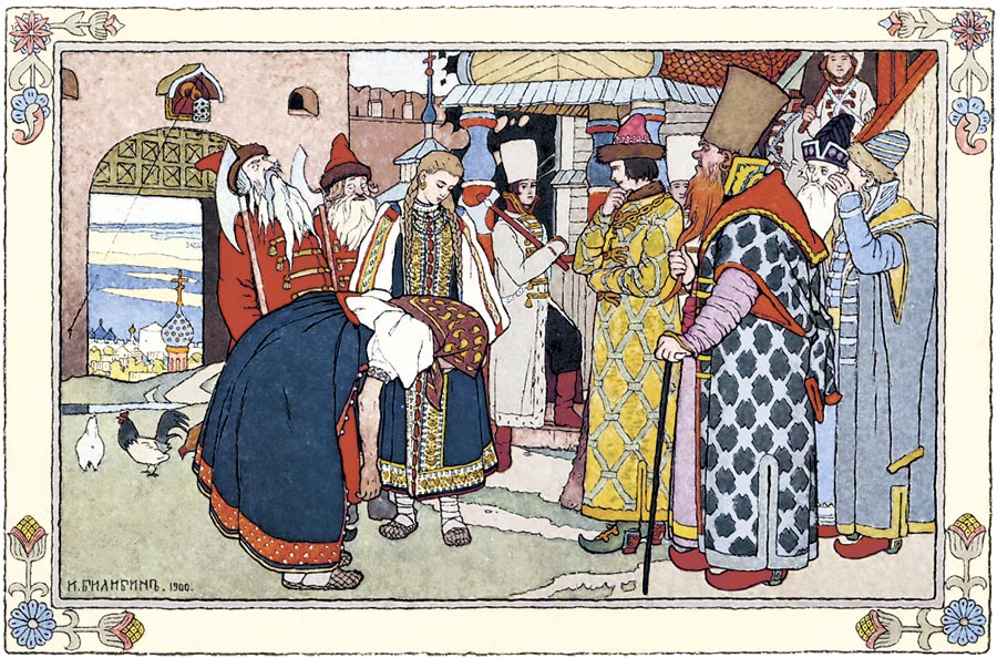 Вот старшие братья явились на пир со своими жёнами, разодетыми, разубранными; стоят да над Иваном-царевичем смеются: