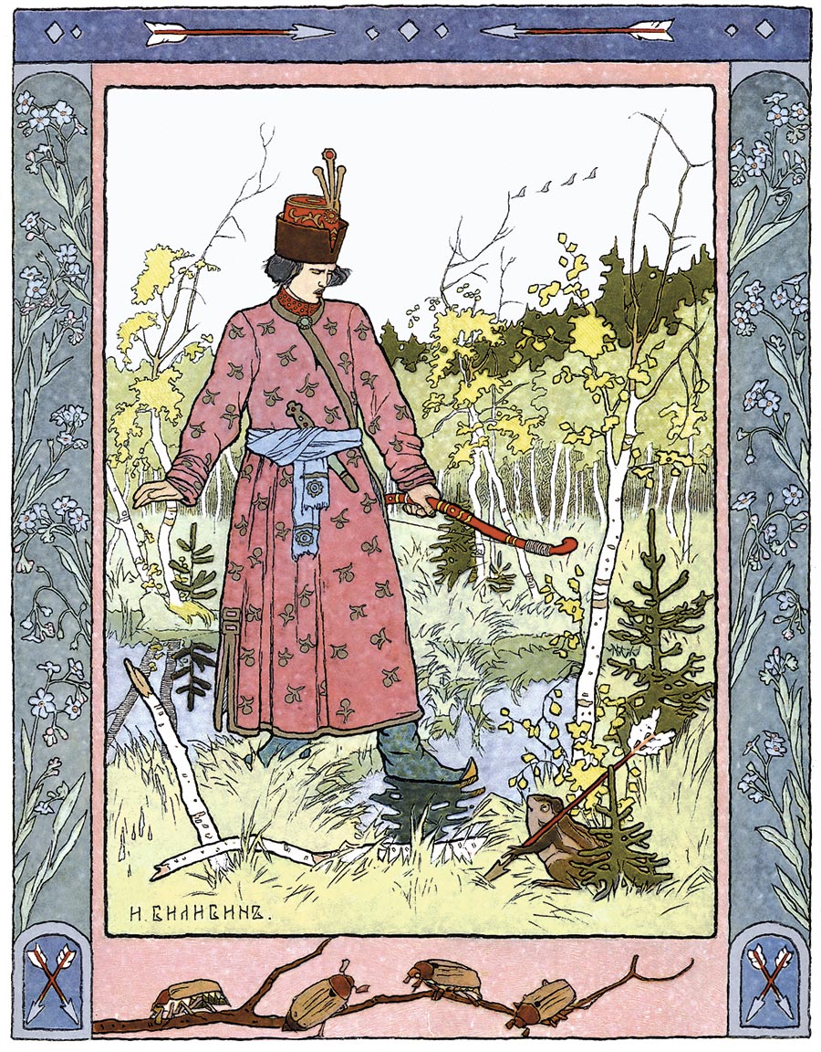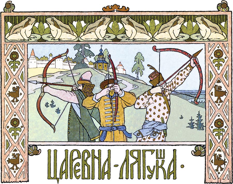 Пустил стрелу старший брат – упала она на боярский двор, прямо против терема девичьего. Пустил средний брат – полетела стрела к купцу на двор и остановилась у красного крыльца, а на том крыльце стояла девица-красавица, дочь купеческая. Пустил младший брат – попала стрела в грязное болото, и подхватила её лягушка-квакушка.