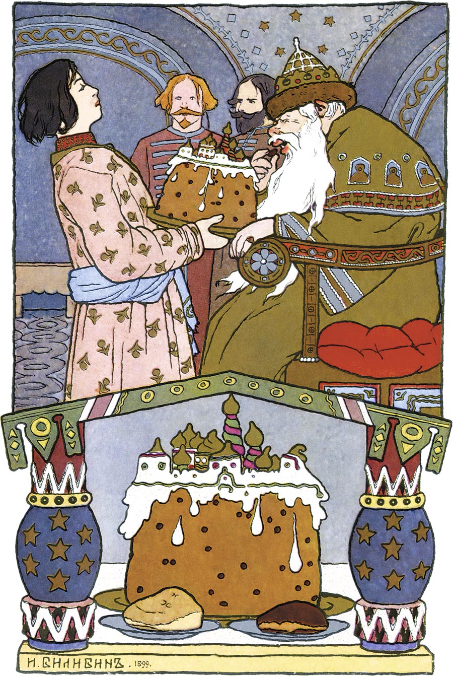 Наутро проснулся Иван-царевич, у квакушки хлеб давно готов – и такой славный, что ни вздумать, ни взгадать, только в сказке сказать! Изукрашен хлеб разными хитростями, по бокам видны города царские и с заставами. Обрадовался Иван-царевич, завернул хлеб в полотенце и понёс к отцу.