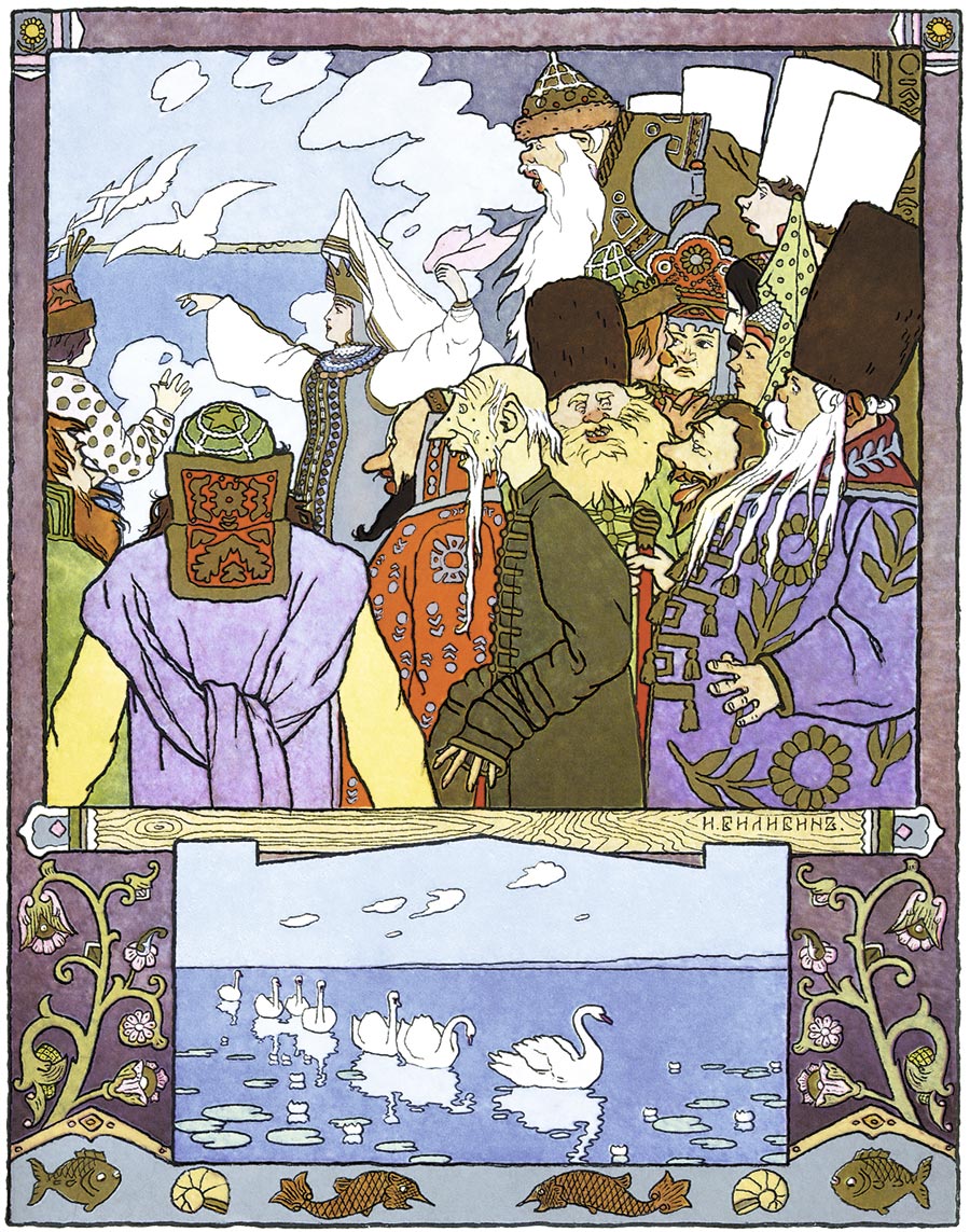 Попили-поели, пришёл черёд плясать. Пошла Василиса Премудрая танцевать с Иваном-царевичем, махнула левой рукой – сделалось озеро, махнула правой – и поплыли по воде белые лебеди. Царь и гости диву дались.