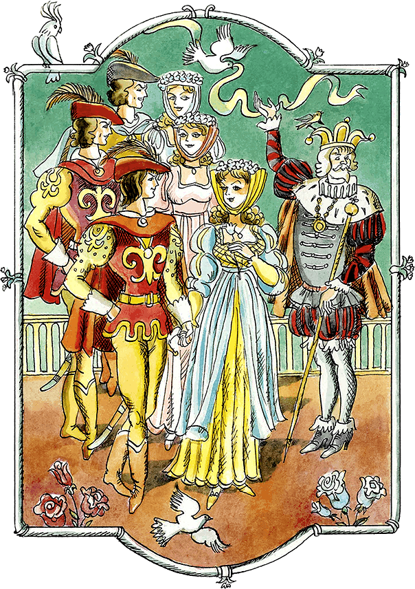 Она-то про своего гостя ночного, жениха нареченного, думала. А во дворце уже собралось народу видимо-невидимо, уже и священник вперед выступил – сейчас будет венчать молодых. Только тут королевна узнала, за кого ее выдают!