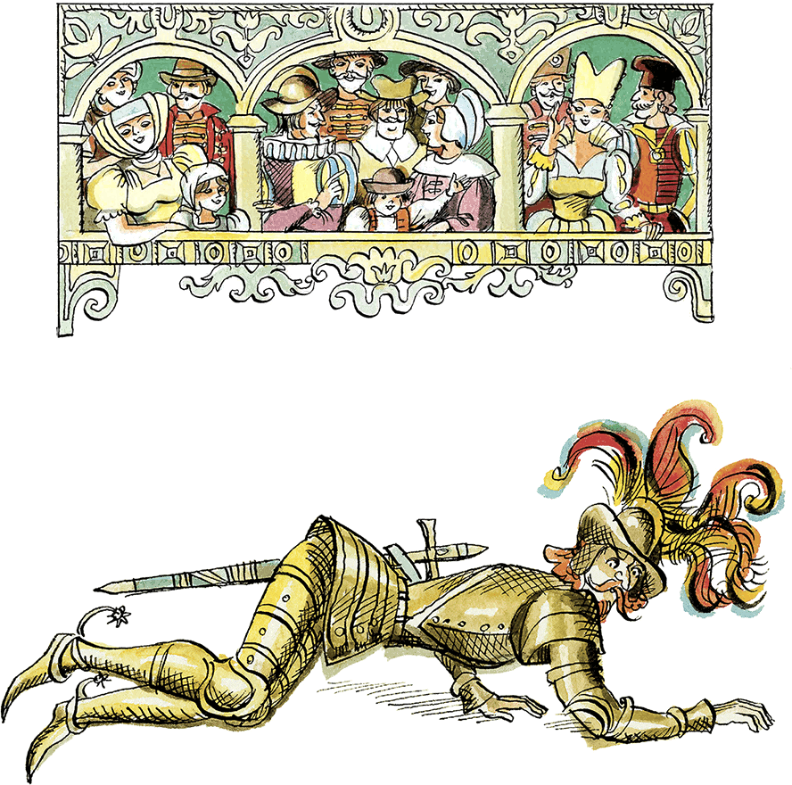 И вот послушайте, какое чудо тут приключилось! Только-только три королевича во двор королевский вошли и на первую ступеньку ступили – из-под Рыжего Витязя одна подушка сама собой выскользнула. Они на вторую ступеньку – вторая подушка прочь летит. А уж когда братья в залу вступили – из-под Рыжего Витязя и кресло вывернулось, так что он лягушкою наземь шлепнулся, руки-ноги раскинув.