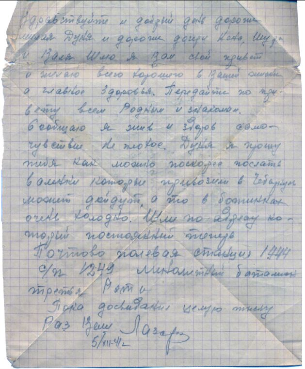 Здравствуйте дорогая и много уважаемая моя семья Маня Боря Тятя Мама и Кока шлю я вам свой фронтовой пламенный привет и горячий поцелуй еще передайте привет Зое Петровне Ивану А. и фаи затем сообчаю что я жив и здоров пока на нашем направление фронта пока спокойно ну а дальше не извесно что будет Тятя писмо я от тебя получил где пишеш что слюбимым моим сыном ходите собирать мурашиные яица только рыбачить не бери еще его ато может потонуть у купальни пожалуй и большому не выбратся ну дров тятя пишеш что запасли это не плохо ситым лутьше запасыть чем зимой можно то больше возите пока машка дома ато могут ее взять в армию тятя если и сена настывите да можно возить то хоть прокорову хоть на возите. Мама а как морька все еще двумя доит сесками или всеми четырми и как же нонче отелилась или нет и как молока дает хвотает нет сыну меня теперь нет мой пай ему отдавайте я очень любил выпить кружку бывало молока. Маня передай привет Бабиковым и передай еще что от Александра П. получил еще одно писмо 25/VI он писал 16/VI он пишет у него тоже пока спокойно я ему Маня тоже написал ответ и будем писать до тех пор пока не окончим с фашистами войну или пока будим живы он пишет что земляков с ним нет ни кого и я ему сообчил что и сомной нет никого