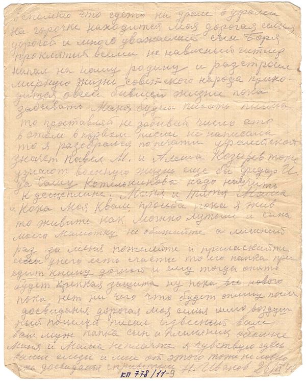 Здравствуй дорогая моя семья супруга Маня сын Боря шлю я вам свой кр-кий пламеный привет и горячий поцелуй еще шлю по привету тестю теще пети марусе Вите Валентину тоне юре и Бабушке затем Маня передай привет Отцу и Матери и Няньке Маня пишу с дороги приехали Саратов скоро будем наверно на фронте от вас счас я писем не получаю да и не откуда получать хотя которые и услали то нам в дороге ни передают а вот уже приедим на место тогда быть может получу Маня я опишу еще на счет сыньеных сапог вочтобы то, не встало а сапоги ему сделайте ему будет и вам большей поминок а я приеду то ему скажу что это я приказал сшить Маня часто вспоминаю г. свердловск да еще проезд последний через уфалей и сыновье слова все на уме как он мне жаловался что обижает матка да стакими горькими слезами Маня погода наверно и на урале хорошая небость мои друзья собираются на охоту а моя нонче охота на гитлера на фашизм проклятый Маня не водном писме не описывала про уфалейских которые вместе сомной уехали где оне я ни кого незнаю и ты наверно никого не видиш их жен. Маня жутко становится что если какой случай случится и не увижу больше всех вас с сыном и счас очень и очень соскучился я о вас ровно бы посмотреть опять на вас как поехал из свердловска ровно считаю легче бы было ехать и воевать Маня Красноармейцев и много едит ту своих уфалейских не вижу ни кого незнаю как дальше встречу или нет всеже уфалей ских много в армию взяли ну да Маня сдесь все одинаковые и знакомые да еще лутьше с чужимито я еду с лейтенантом вместе рядом лежим в месте кушаем в месте пищу и даже табачок из одного кашелька курим только весь вышел счас наверно до места не получим парень хоть молодой ну толковый говорит ну Иванов в месте будем воевать Маня еду на фронт пом. ком. взвода прийдется бойцами командовать да и счас приходится командовать Маня хоть бы повстречатся с Александром Петровичем вот было бы унас сним радости скоро год как не видемся он спервых дней войны все на фронте я уже шестой месяц как издома а кажется Маня уже больше чуть ли не год ну ничего Маня неподелаеш Маня дорогой едим и все дорогое яица 50 руб. 10 шт 5 р. штука молоко 20 руб. литр ну нас кормят не плохо да как ком состав еще привелегия есть полистку получаем вобчем насчет еды пока обижатся не приходится сахар ежедневно 25 грам получаю да Маня кабы войны не было то на сухом бы куске стал жить только бы с вами с сыном ну а раз навязал нам проклятый изверг войну то пока Маня не разобьем придется по скучать ну пока все маня передай привет всем родным и знакомым Алеше всеже подвезло вернулся пока досвиданья дорогая Маня и дорогой сын Боря и все мои родные Петр А. Теща Петя Маруся и Витя писал извесный вам ваш муж и папка Ник Иванов писал 18/IV 42. семье Ивановой Мане и Бори