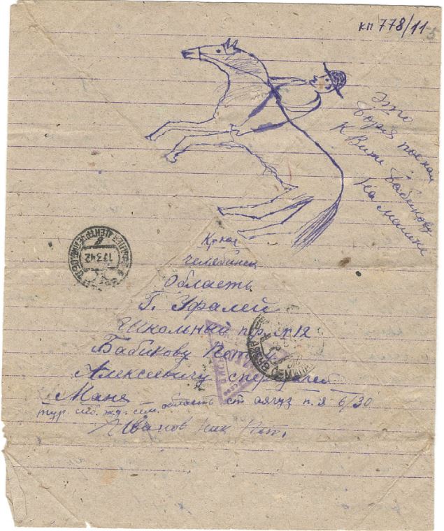Здравствуйте дорогие мои и родные Жена Мария Пет cын Борис Ник. и родители Тятя Мама и Кока вопервом посылаю вам Кр-ский пламеный привет и горячий воздушный поцелуй а сына Крепко крепко прижемаю ксвоей груди и маленькое нежное личеко. затем сообчаю что я жив здоров чего и вам желаю 23/II унас был праздник день красной армии водили нас в клуб на кино салават юлаев картина хорошая был хороший обед ну вобчем праздник мы встретили в г. аягуза сейчас занимаемся опять постарому на фронт еще незнаю когда поеду ну наверно придется подратся с ненавистным врагом всего человечества