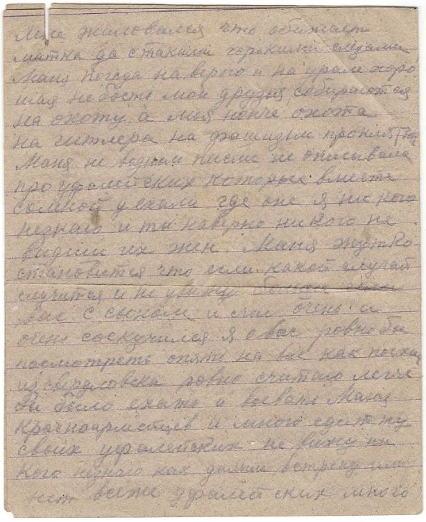 Здравствуй дорогая супруга Мария Петровна и дорогой сын Борис Николаевич Шлю я вам свой Кр-ский пламенный привет и горячий воздушный поцелуй Затем Маня передай привет тестю Петру А. теще Екатерине Ф. Пете Марии Г. и племяшу Виктору А. Маня письмо твое получил которое писала 23/II Зачто сердечно благодарю обижаешся что не спрашиваю насчет твоего сдоровья да это верно что не спрашивал да признатся и не очем то не спрашиваеш выбереш время и не можеш сообразить чего надо на писать да и другое думаеш только бы сообчить что жив сдоров что бы знали где я и не беспокоились шибко Маня мне очень хотелось узнать что оплачевают или нет вам пособие ну наверно счас не узнаю до нового моего адреса всеже наверно скоро мы тронемся хотя не чего не извесно ну надо распологать даром хлеб кушать недолжны а надо заклятого врага всего человечества уничтожать как змеиного гада.
