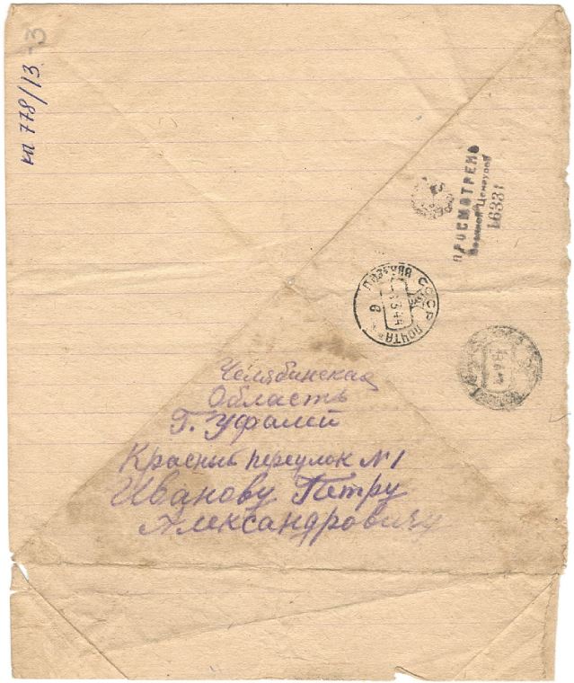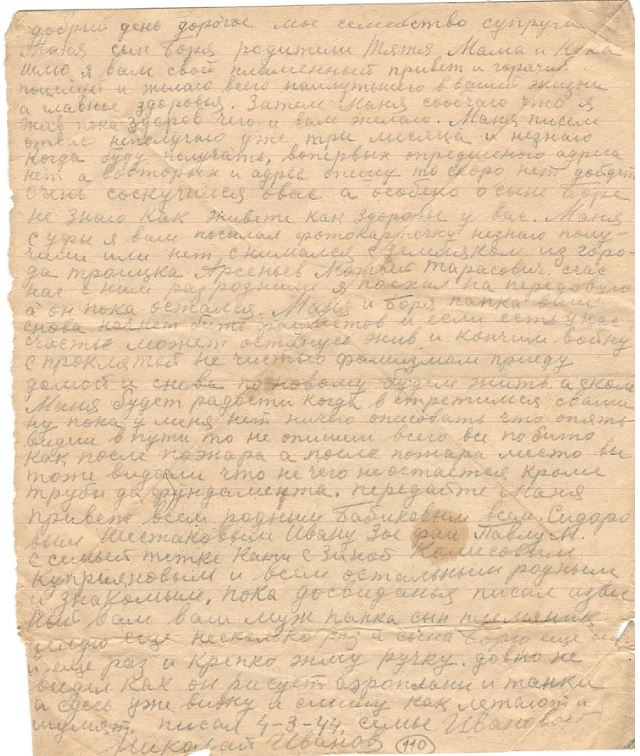 Добрый день мое семейство супруга Маня сын Боря родители Тятя Мама и Кока шлю я вас свой пламенный привет и горячий поцелуй и желаю всего наилутьшего в вашей жизни и главное здоровья. Затем Маня сообчаю что я жив пока здоров чего и вам желаю. Маня писем отвас неполучаю уже три месяца и незнаю когда буду получать, вопервых определеного адреса нет а вовторых и адрес опишу то скоро нет дойдет очень соскучился овас а особено о сыне Боре не знаю как живете как здоровье у вас. Маня с уфы я вам посылал фотокарточку незнаю получили или нет снимался с земляком из города троицка Арсеньев Матвей Тарасович. счас нас с ним раз рознили я поехал на передовую а он пока остался. Маня и Боря папка ваш снова начнет бить фашистов и если есть унас счастье может останусь жив кончим войну с проклятой не чистью фашизмом приеду домой и снова по новому будем жить а сколь Маня будет радости когда встретимся свами ну пока у меня нет ничего описовать что опять видели в пути то не опишешь всего все по бито как после пожара а после пожара место вы тоже видели что не чего не остается кроме трубы да фундамента. передайте Маня привет всем родным Бабиковым всем Сидоровым Шестаковым Ивану Зое Фаи Павлу М. с семьей тетки Кати и Зиной Калисовым Куприяновым и всем остальным родным и знакомым. пока до свиданья писал извесный вам ваш муж папка сын и племянник целую еще несколько раз и сына Борю еще и еще раз и крепко жму ручку. довно не видел как он рисует аэропланы и танки а сдесь уже вижу и слышу как летают и шумят. писал 4-3-44. семье Ивановой