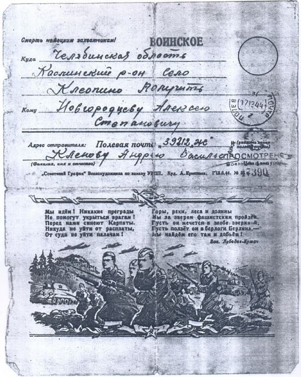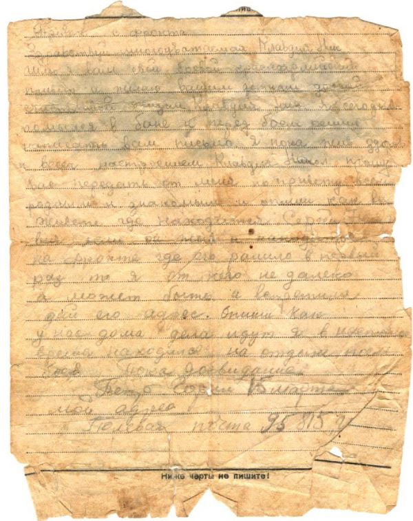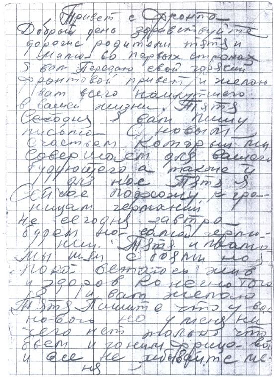 Добрый день здравствуйте дорогие родители тятя и мама во первых строках я вам Передаю свой горячий фронтовой привет и желаю вам всего наилутшего в вашей жизни. Тятя Сегодня я вам пишу письмо С новым счастьем. Который мы совершаем для вашего будущего, а также и для нас Тятя я Сейчас подхожу к границам германий не сегодня завтра будем на самой германии. Тятя и мама мы шли с боями но я пока остаюсь жив и здоров Конечно того и вам желаю Тятя Пишите что у вас нового но у меня ни чего нет только что бьем и гоним фрица вот и все не забывайте меня
