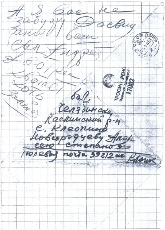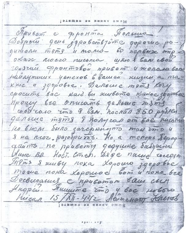 Добрый день здравствуйте дорогие родители тятя и мама во первых строках моего письма шлю я вам свой горячий фронтовой привет и желаю вам найлутших успехов в вашей жизни, а также и здоровье. Дальше тятя хочу спросить вас как вы живете какое здоровье прошу все описать дальше тятя сообчаю что я вам. послал 850 рублей дальше тятя я получал от вас письмо но в нем было зачеркнуто так что и я не мог. разобрать. Но, а теперь Передайте по привету дедушке бабушке Анне ВЛ. Наст. Степ. Дяде паше соседям Тятя я живу пока хорошо здоровье тоже пока хорошее вот и пока все Досвидания с приветом ваш сын Андрей. Пишите что у вас нового писал 15/XII -44 г Лейтенант Кленов