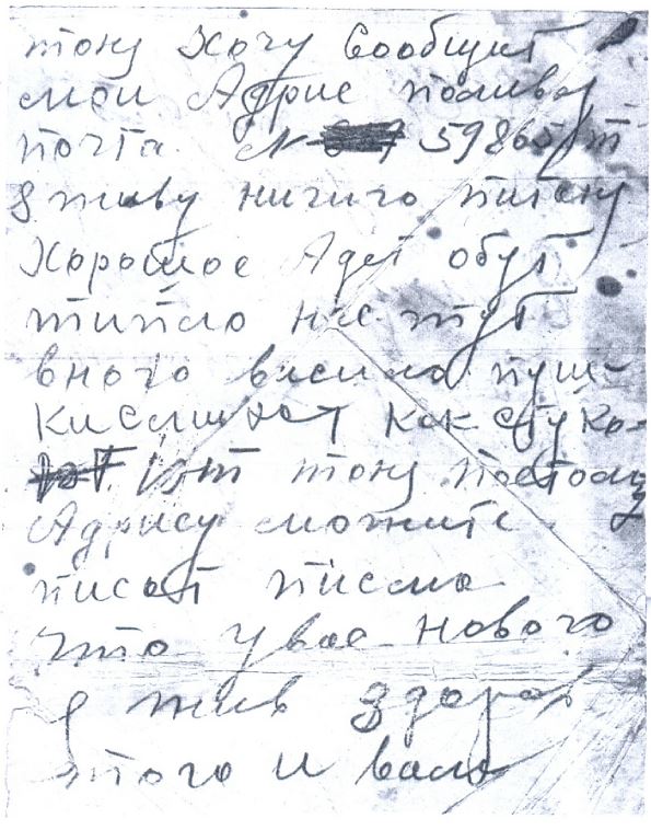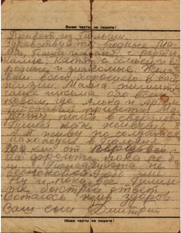 Здравствуйте родные Мама, Паша и Саня с ребятишками, Катя с семьей и все родные и знакомые. Желаю вам всего хорошего вашей жизни. Мама пишите чаще письма обо всем новом, где Алька и Артем. Передавай приветы Марату, пиши в свердловск. Пиши как живешь А я живу по солдатски нахожусь в Польше 20 км от передовой на фронте пока не были. Пожалуйста не беспокойся обо мне. Ну и пока все. Пишите быстрей ответ Остаюсь жив здоров. Ваш сын Дмитрий