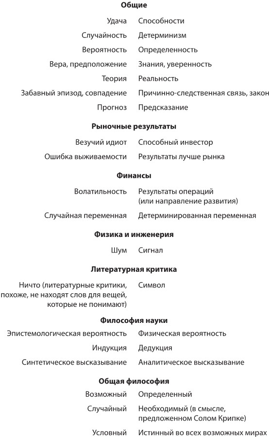 Эта книга – о замаскированном везении, которое часто путают с чем-то другим (например, способностями), и в целом о замаскированной случайности, которую часто принимают за детерминизм. Есть выражение «везучий дурак», когда речь идет о человеке, получающем выгоду от непропорциональной доли удачи, но приписывающем свой успех чему-то другому, обычно какой-то определенной причине. Такая путаница встречается в самых неожиданных областях, даже в науке, хотя и не так подчеркнуто и очевидно, как в мире бизнеса. Она характерна для политики и, например, может выражаться в рассуждениях президента страны о рабочих местах, которые «он» создал, о «его» восстановлении экономики и об инфляции в результате действий «его предшественника».