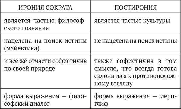 Сближает же иронию Сократа и постиронию их потенциальная софистичность: каждая из них – обоюдоострое лезвие, способное поворачиваться в обе стороны. Это хорошо чувствовали современники Сократа: серьезные философы-эвристы, нацеленные на поиск истины, упрекали Сократа в софистичности, а чистые софисты, для которых главной целью была интеллектуальная игра как таковая – наоборот, в чрезмерной серьезности.