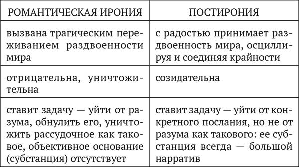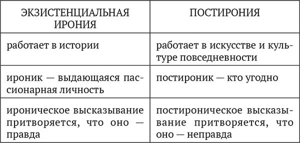 Хотя невозможно провести знак равенства между огромным количеством видов и подвидов иронии, в них все же есть общее. Огрубляя, можно сказать, что в каждом из этих видов пафосом иронии становится утверждение чего-либо через внешнее его отрицание. В этом смысле постирония – утверждение чего-либо через внешнее «утверждение», то есть через внешнюю как будто иронию по отношению к утверждаемому.