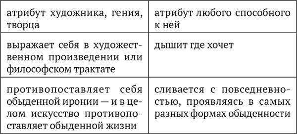 Романтическая ирония – в отличие от постиронии – по своей природе элитарна. Алхимический танец категорий прекрасного и гротескового непонятен тем, чье мышление не способно к включению в себя противоположностей и кого Шлегель называет «гармоническими пошляками». Вообще борьба с обывательским представлением о прекрасном – сквозной сюжет романтизма: финальный номер программного музыкального манифеста Роберта Шумана Карнавал (1835) называется Марш давидсбюндлеров против филистимлян, и это подлинно воинственный жест. Романтизм – это непрерывная война между обывательским и художественным, и граница между этими мирами проходит как раз по линии иронии.