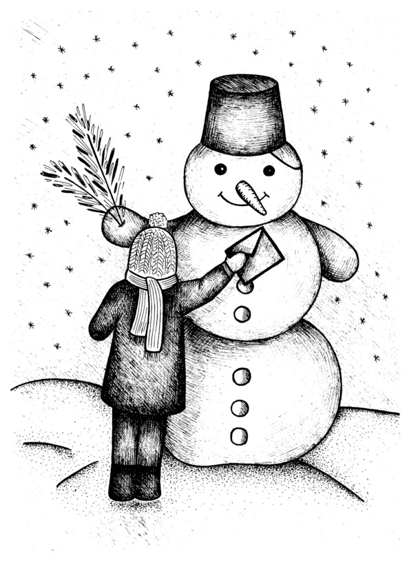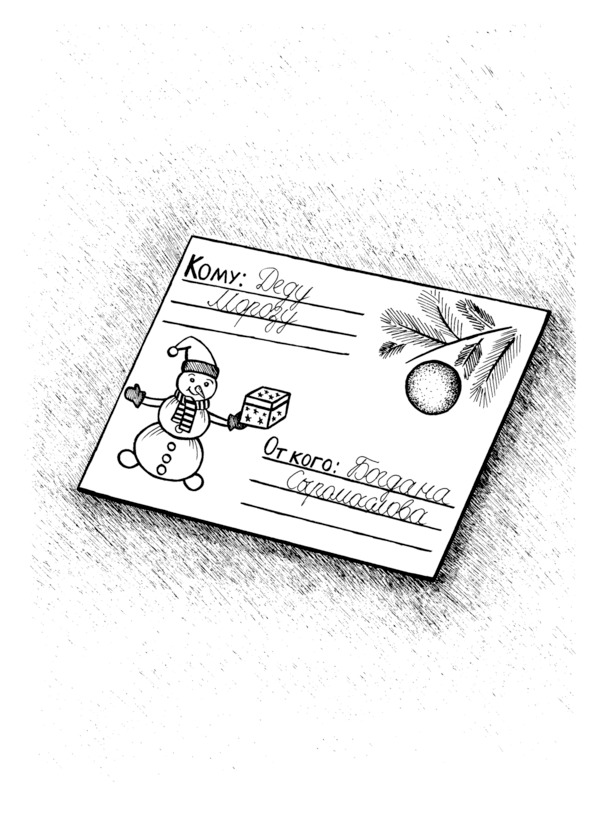 Богдан перевернул лист и нарисовал семью. Все держались за руки и улыбались. Агния заклеила конверт с письмом и отдала брату. Богдан выбежал на улицу, застёгивая чёрный пуховик, и вручил письмо снеговику, а потом шепнул: